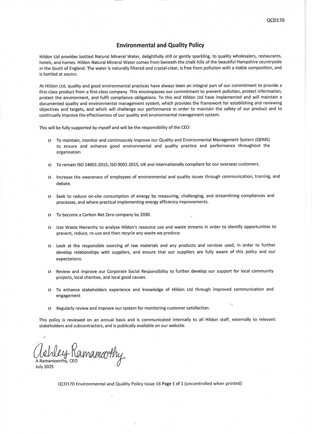 Hildon aims to be the most environmentally friendly and sustainable Natural Mineral Water company in the UK. This investment in solar technology will help make that a reality.